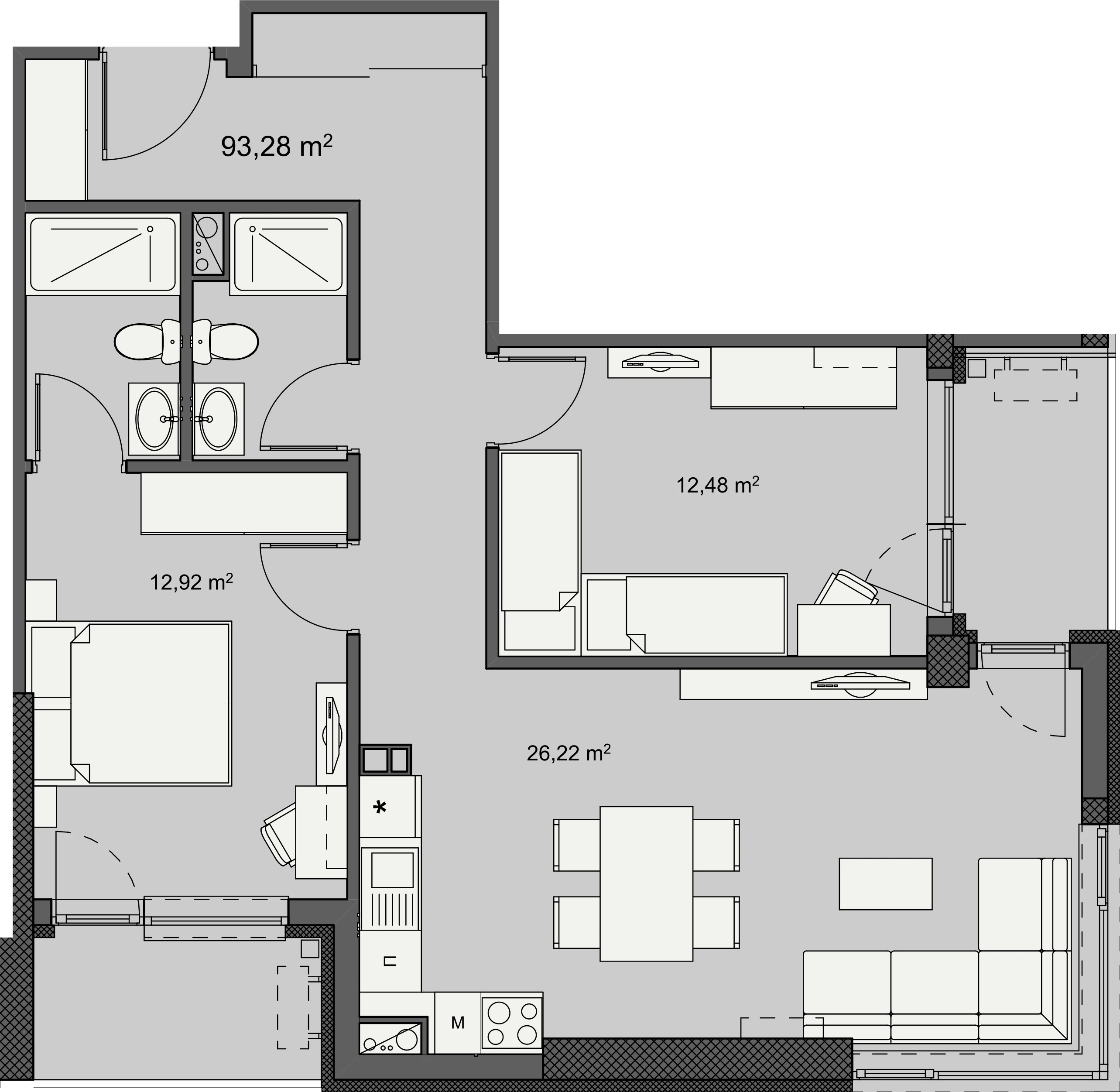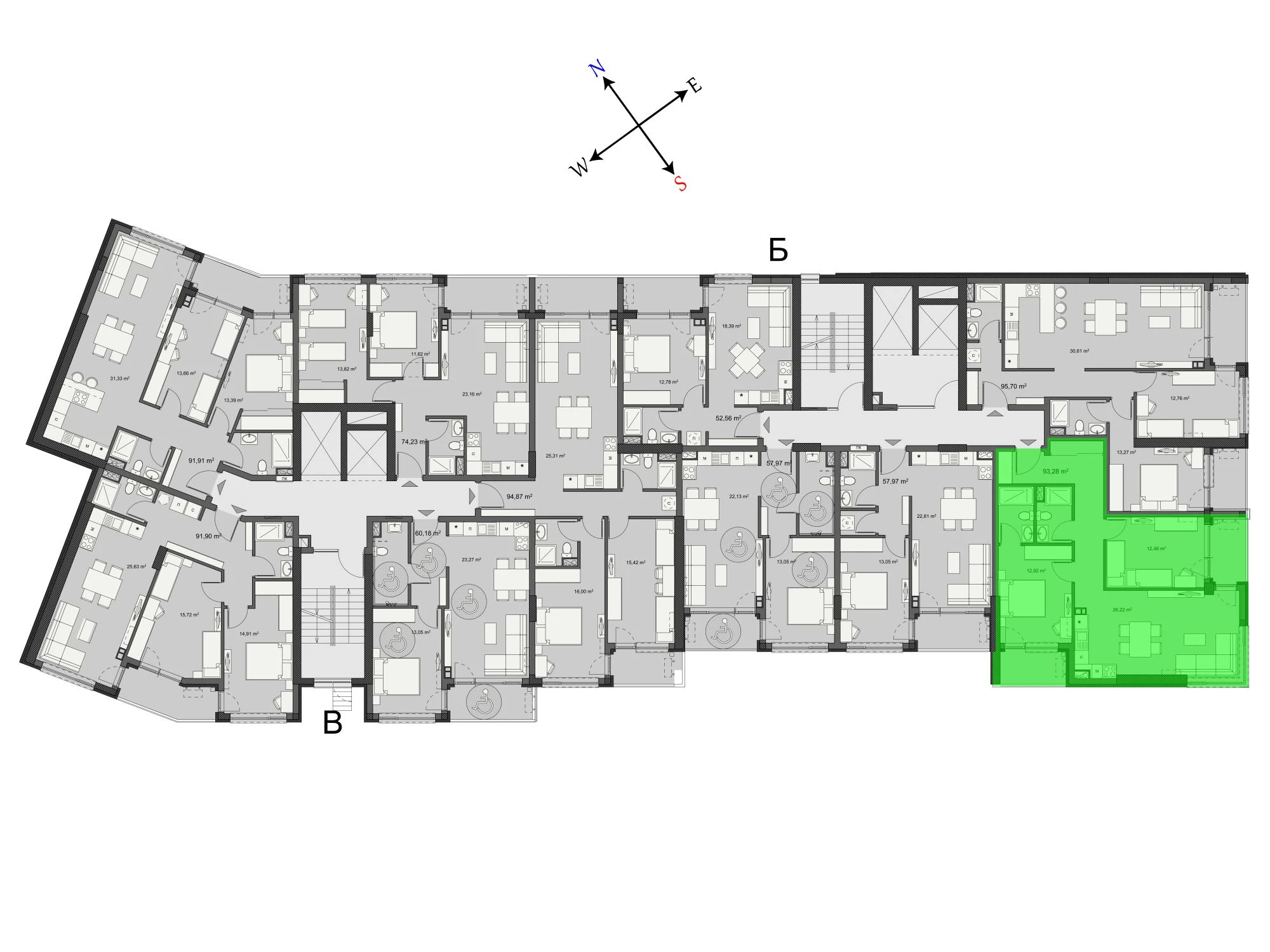Продаден Б102 Вход Б Етаж 1 Стаи 3 Бани 2 Тераси 2 Площ 93.28 m² Обща площ 111.33 m² 3-стаен апартамент с площ 93 м², разположен на етаж 1 в нова сграда в ж.к. Изгрев 147, гр. Бургас.