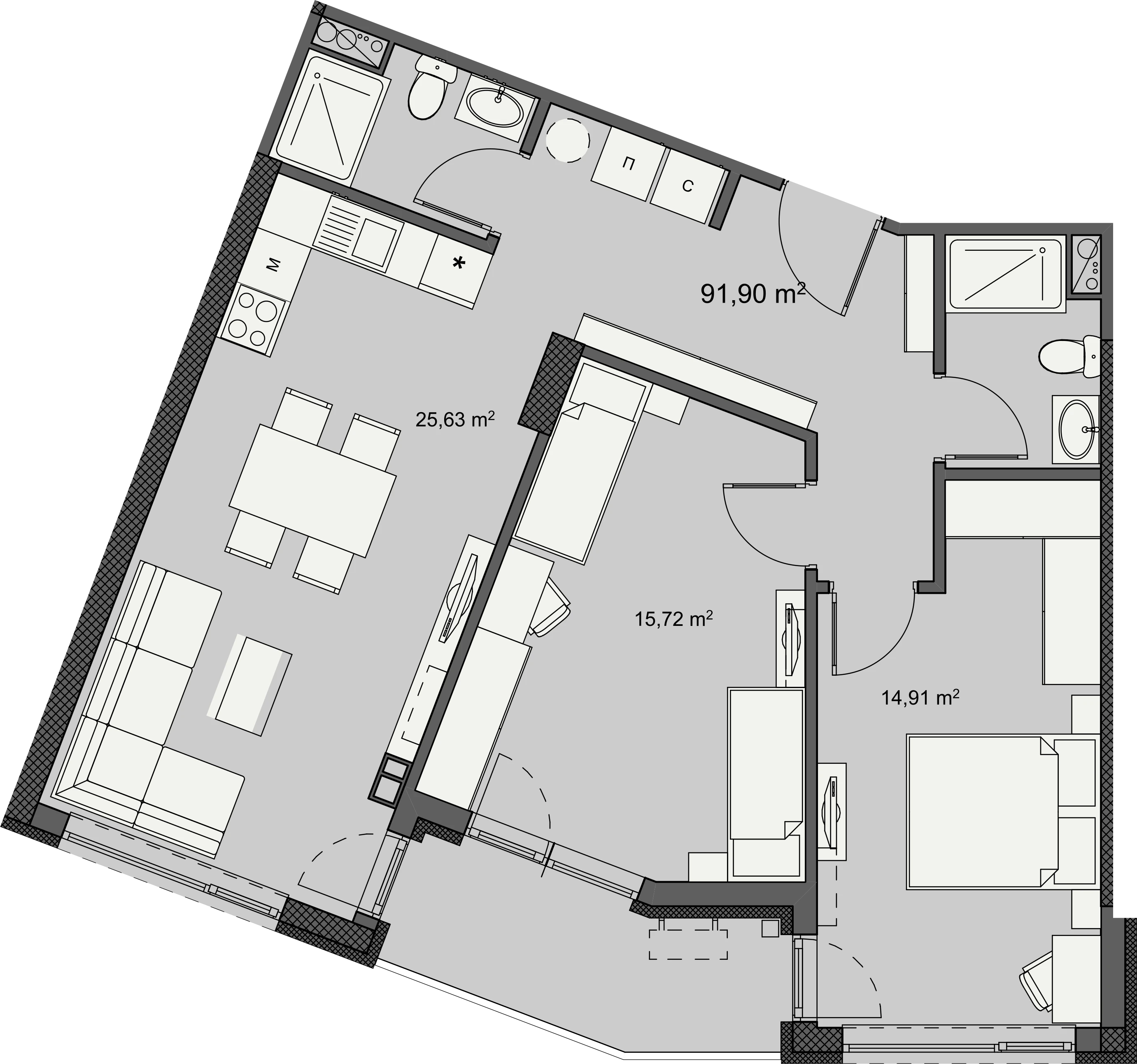 For Sale V101 Entrance V Floor 1 Rooms 3 Bathrooms 2 Terraces 1 Area 91.90 m² Common Area 108.74 m² Inquiry Inquiry V101 Name E-mail Phone Message I wish to receive a newsletters Send Inquiry 3 room apartment with area 92 m², located on floor 1 in new building in Izgrev 147, Burgas City.