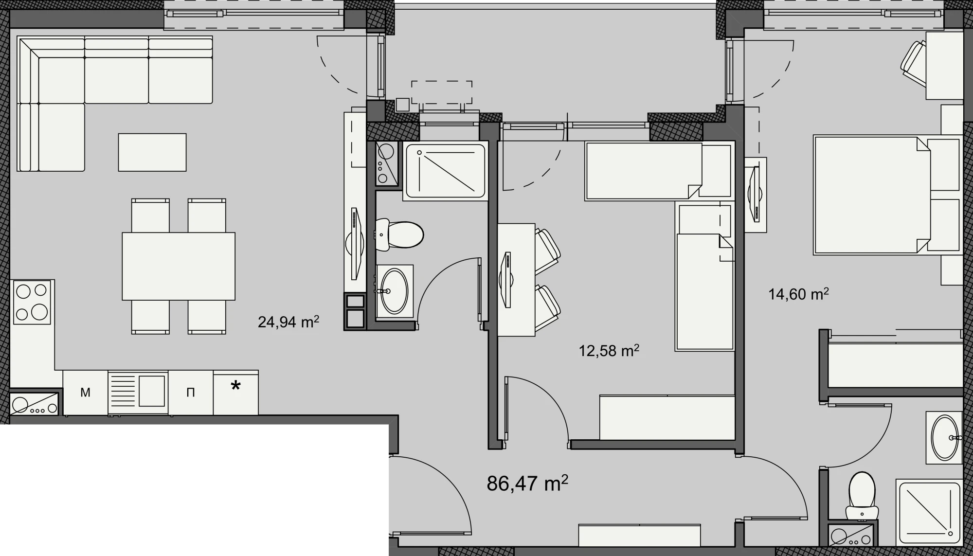 For Sale D1401 Entrance D Floor 14 Rooms 3 Bathrooms 2 Terraces 1 Area 86.47 m² Common Area 102.32 m² Inquiry Inquiry D1401 Name E-mail Phone Message I wish to receive a newsletters Send Inquiry 3 room apartment with area 86 m², located on floor 14 in new building in Izgrev 147, Burgas City.